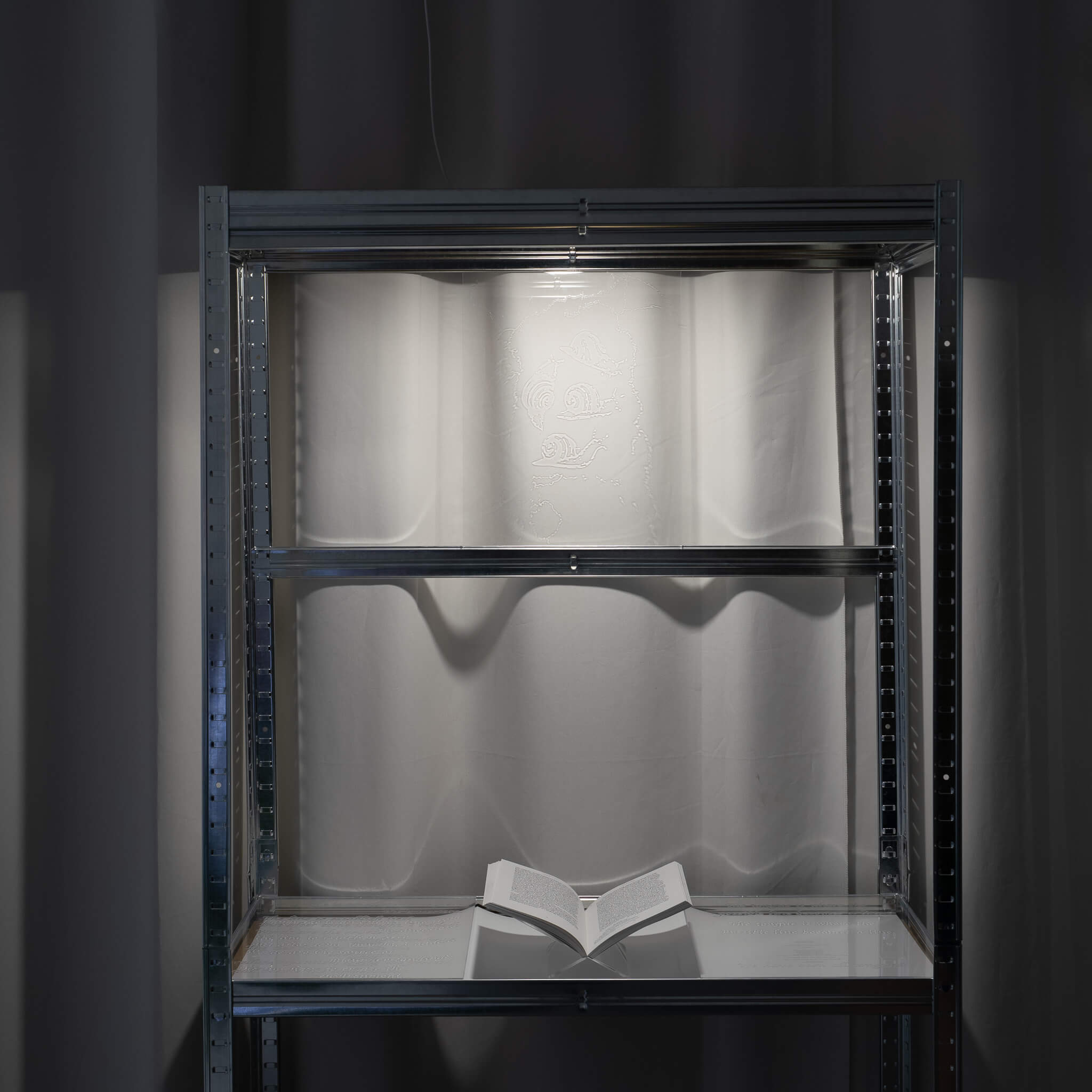 A book and an installation are both imbued with the slimy traces of snails, symbolizing the slow, deliberate paths of thought formed in a language. The snail trails, delicate yet persistent, serve as a metaphor for the way our tongues—through language, speech, and taste—shape our perceptions and understanding of the world. Just as a snail leaves a tangible mark on its environment, our tongues leave an indelible imprint on how we communicate, interpret, and interact with our surroundings. The work explores this relationship, inviting viewers to consider the subtle yet powerful ways in which language and the physical act of speaking influence our reality. The book is the thesis that was written in the years of graduating.